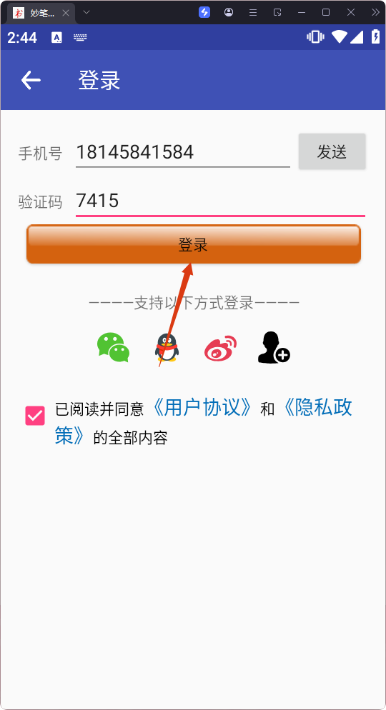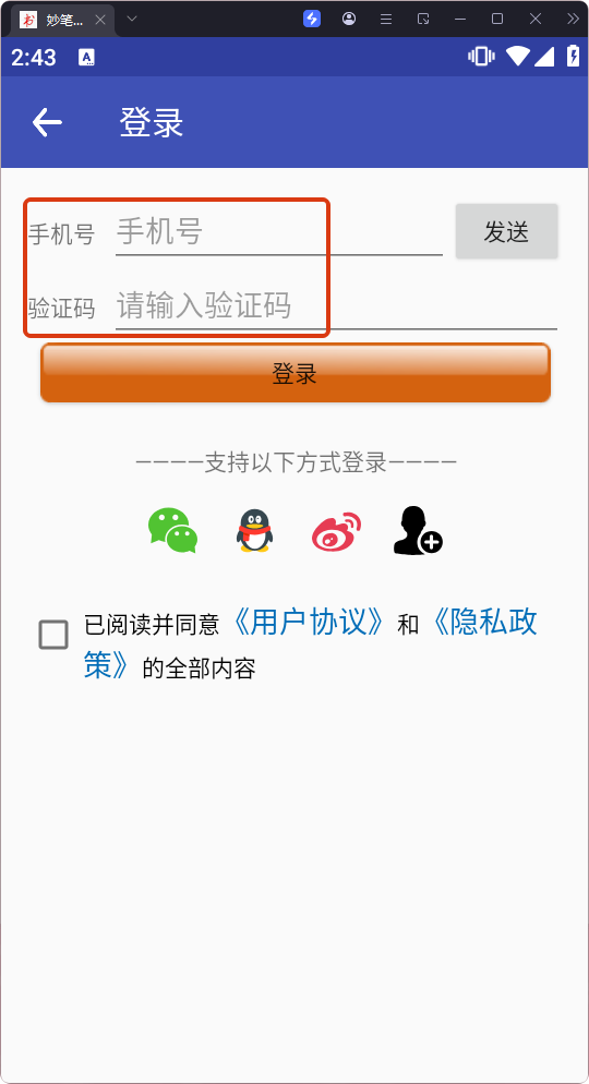 3、在登錄頁面填寫【手機號】,點擊【發(fā)送】獲取驗證碼并輸入,勾選已閱讀并同意《用戶協(xié)議》和《隱私政策》。