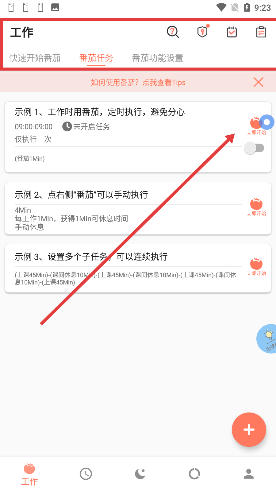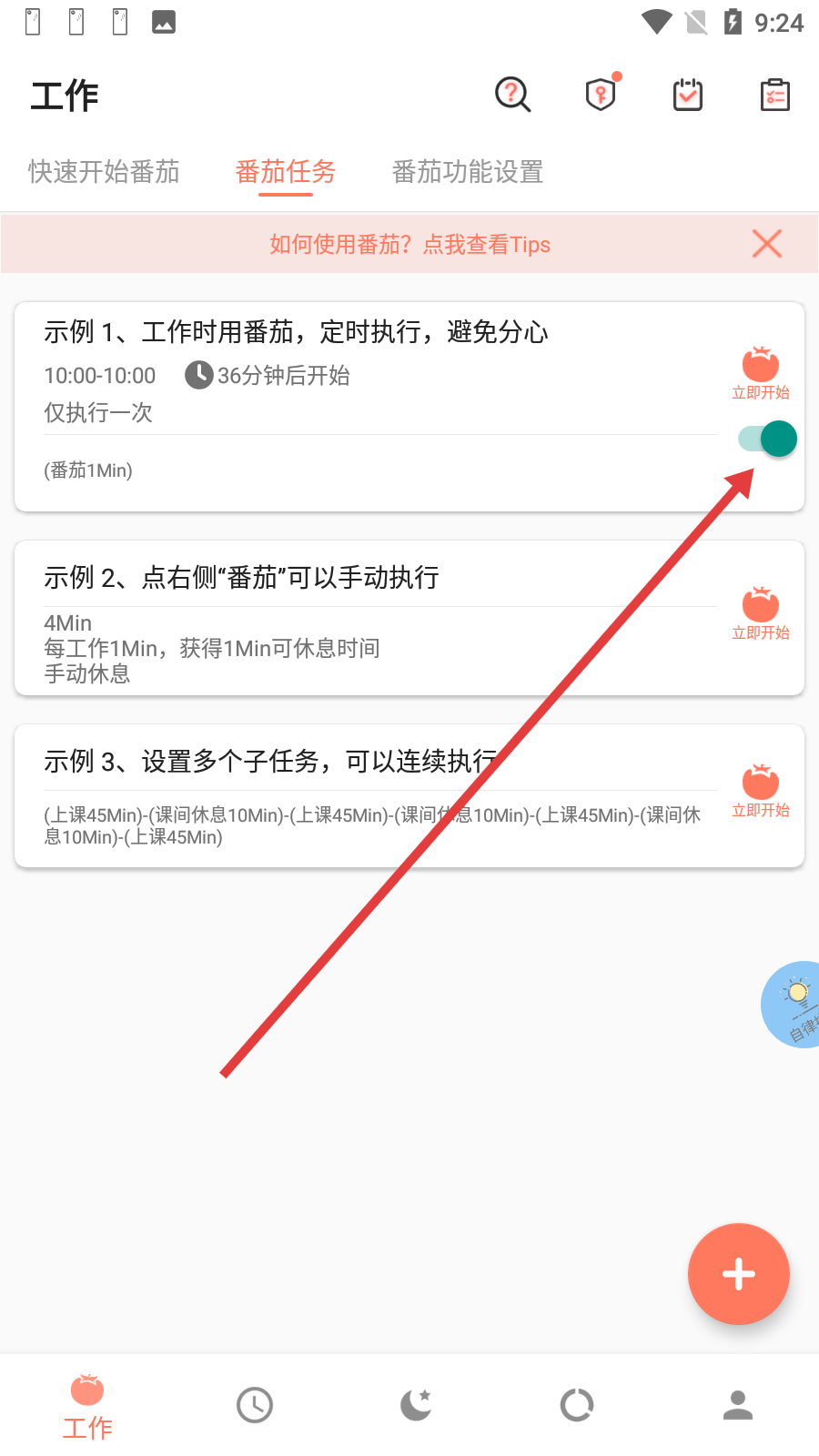 4、返回任務列表,點擊目標任務的開啟開關,啟用該番茄任務。