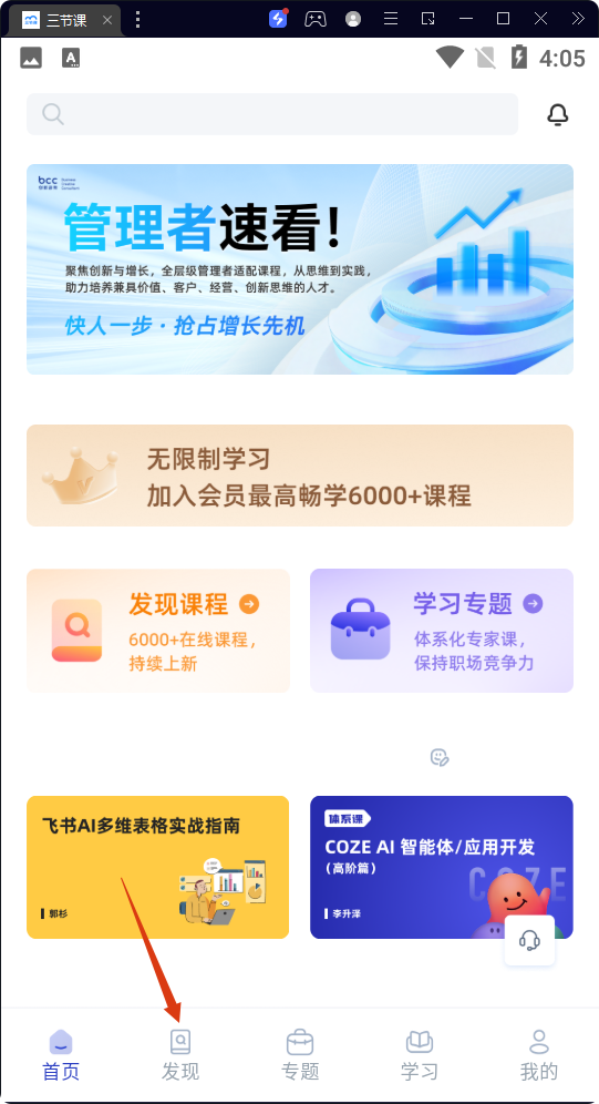 1、點擊底部【發(fā)現(xiàn)】,進入發(fā)現(xiàn)頁面,可查看各類課程列表。