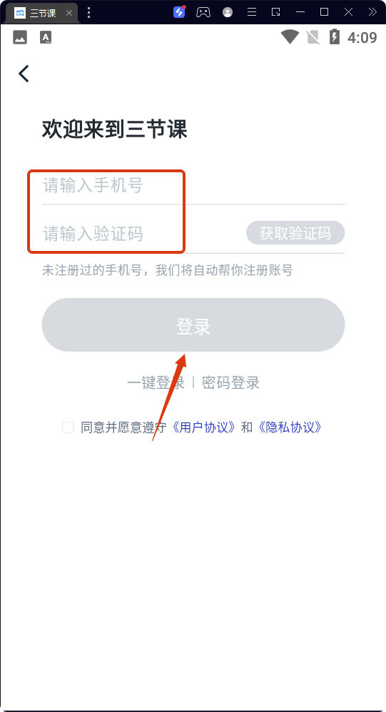 4、在登錄頁面輸入【手機號】,點擊【獲取驗證碼】并輸入,勾選同意《用戶協(xié)議》和《隱私協(xié)議》后點擊【登錄】,完成課程購買操作。