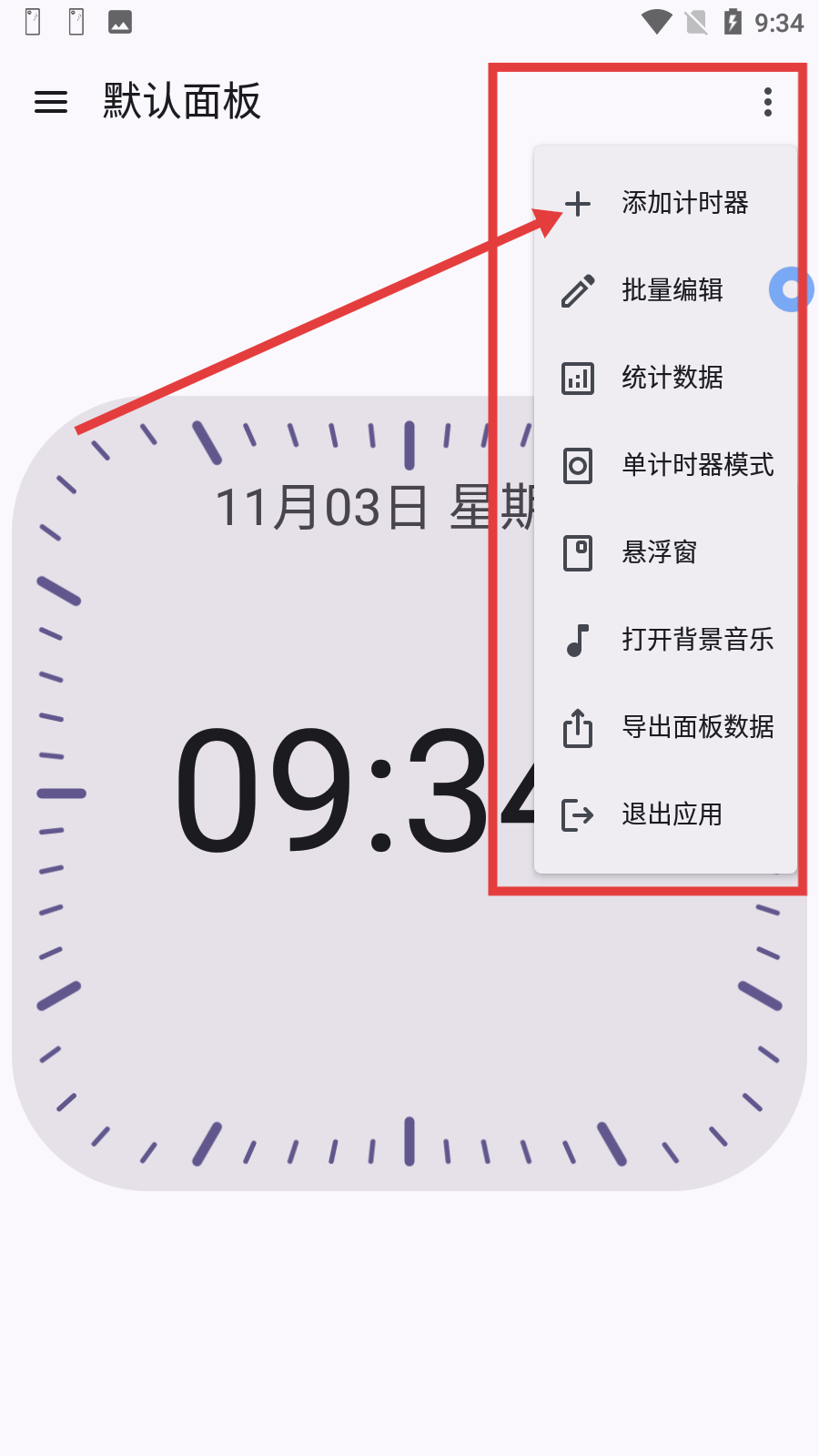 1、主界面點(diǎn)擊右上角【...】圖標(biāo)打開菜單,選擇【添加計(jì)時(shí)器】功能進(jìn)行個(gè)性化設(shè)置。