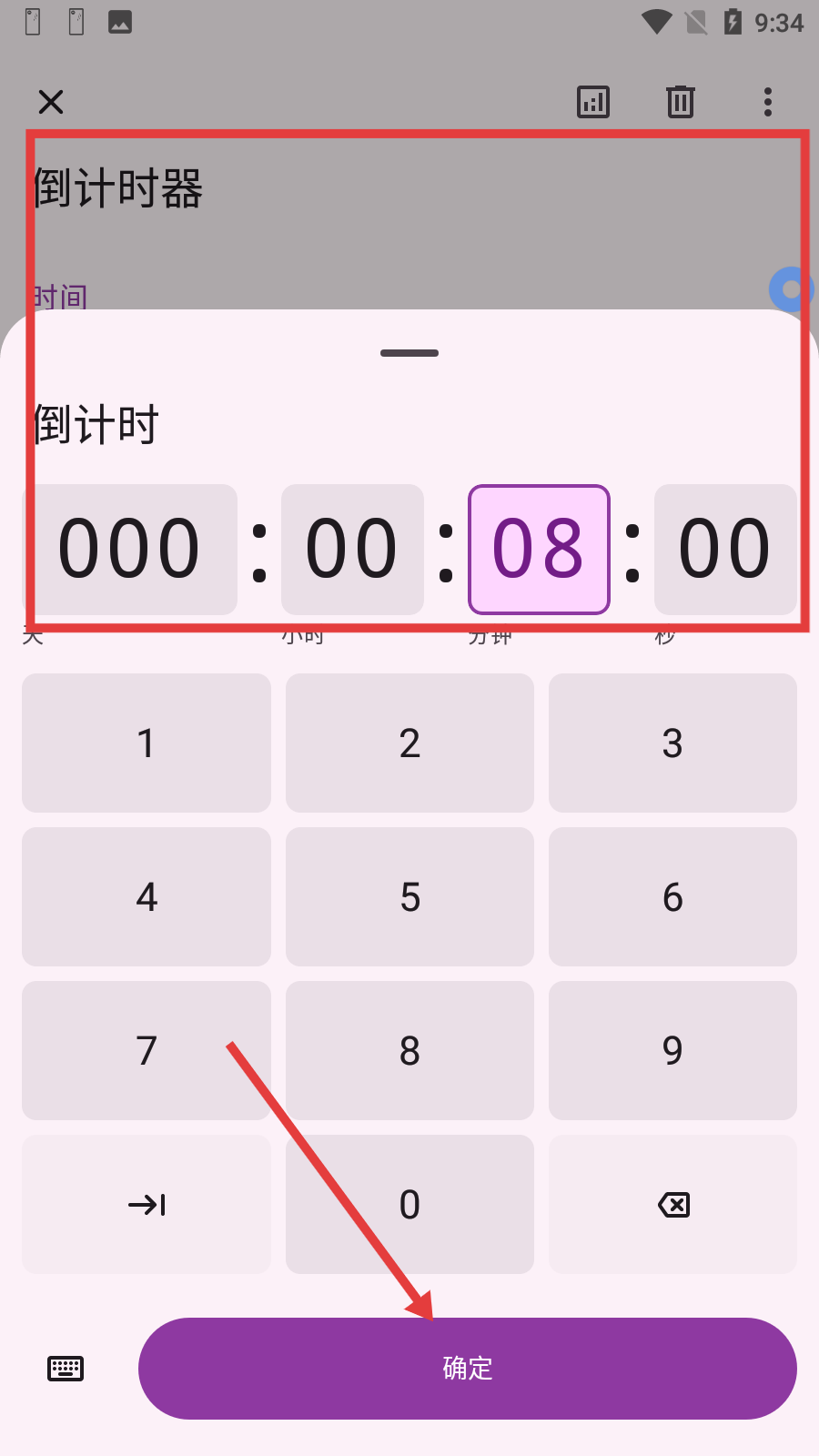 3、設(shè)置【倒計(jì)時(shí)器】時(shí),在時(shí)間輸入界面修改【小時(shí)】或【分鐘】等數(shù)值后,點(diǎn)擊紫色【確定】按鈕即可完成。