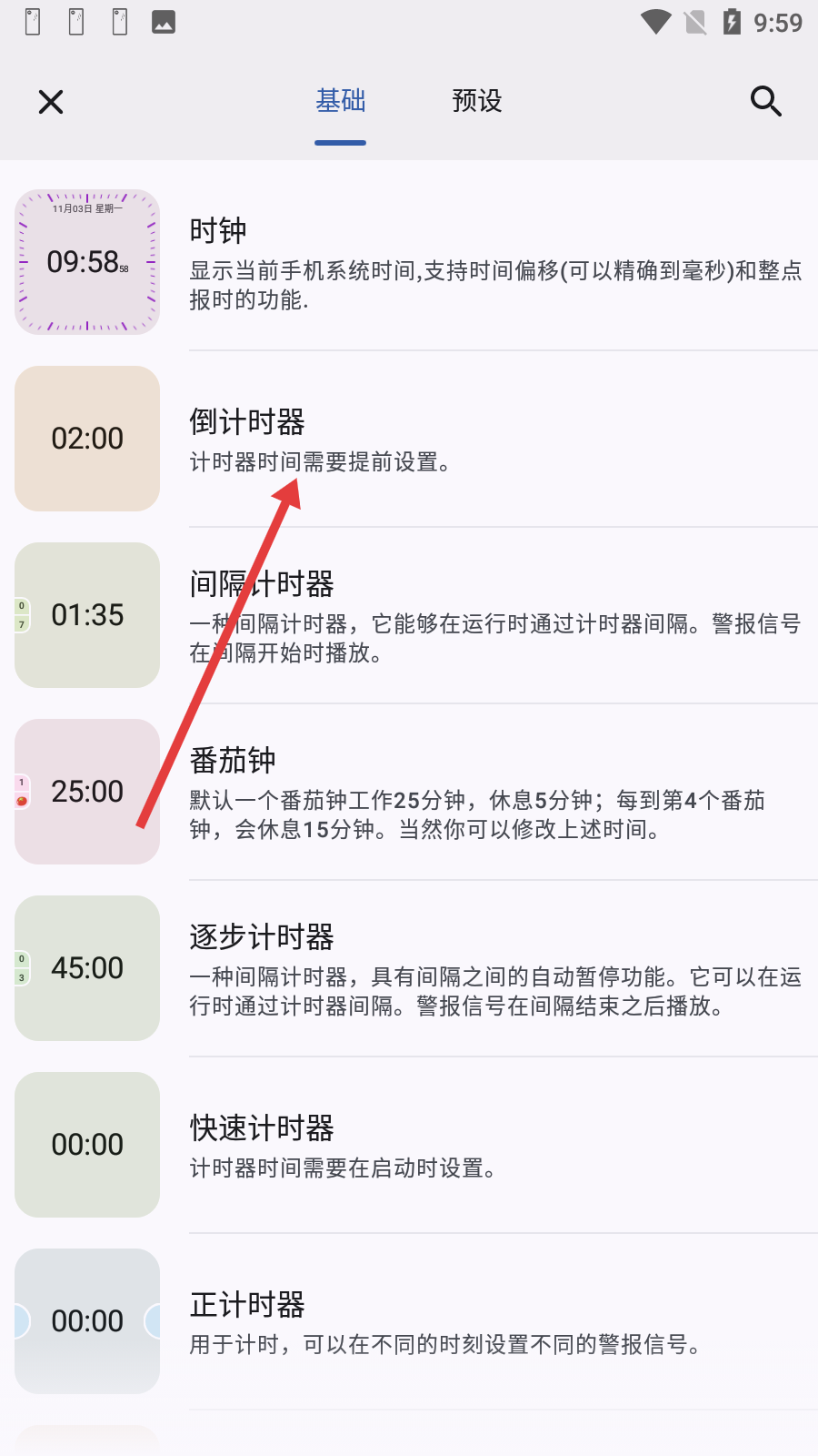 2、在【基礎(chǔ)】標(biāo)簽頁點(diǎn)擊【倒計(jì)時(shí)器】功能。