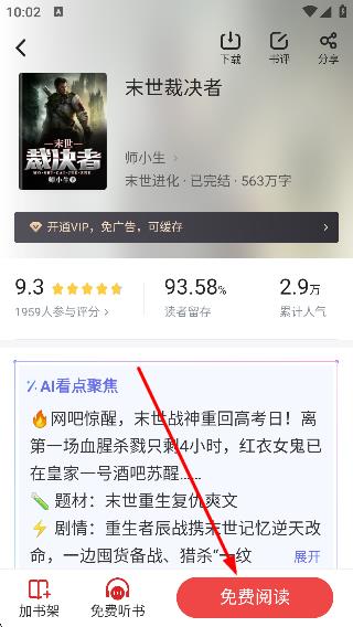 2、在書籍詳情頁面點擊【免費閱讀】,進入閱讀界面。