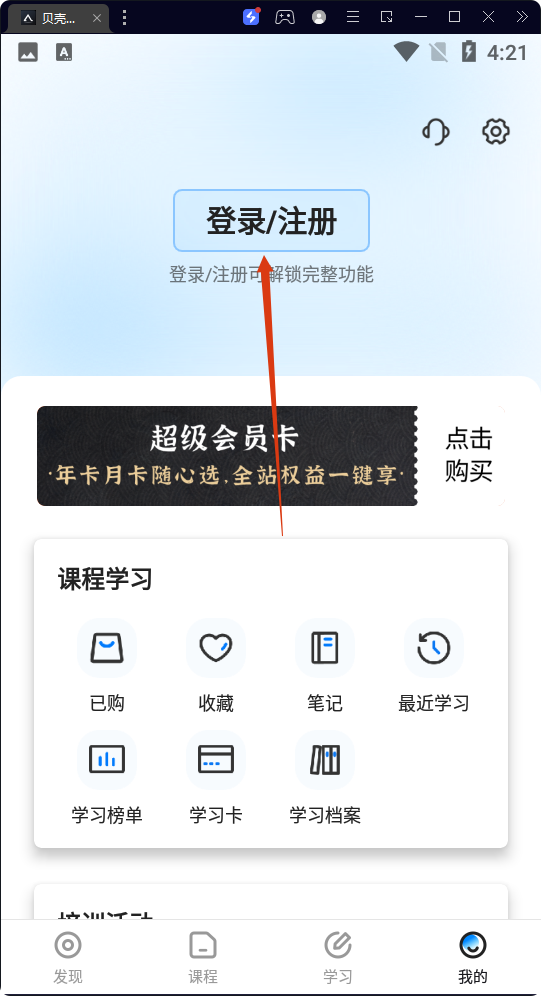 1、點(diǎn)擊底部【我的】,進(jìn)入個(gè)人頁面,可查看課程學(xué)習(xí)相關(guān)功能及登錄/注冊(cè)入口。