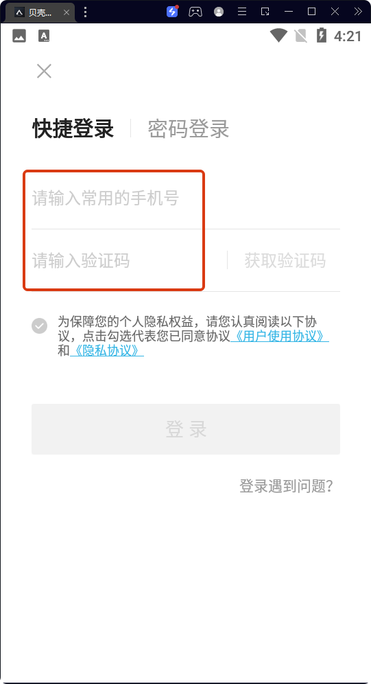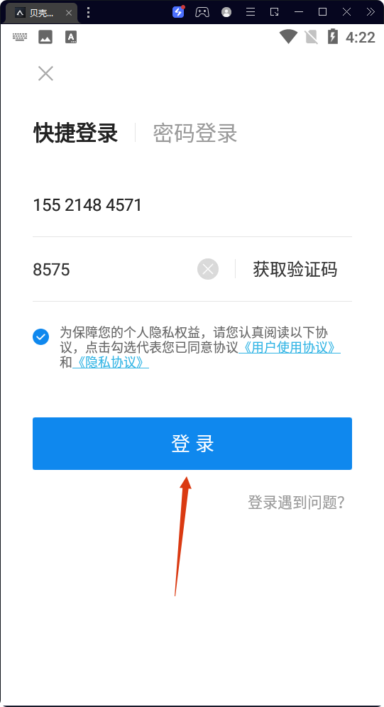 3、在快捷登錄頁面輸入【手機(jī)號(hào)】,點(diǎn)擊【獲取驗(yàn)證碼】并輸入,勾選同意《用戶使用協(xié)議》和《隱私協(xié)議》。
