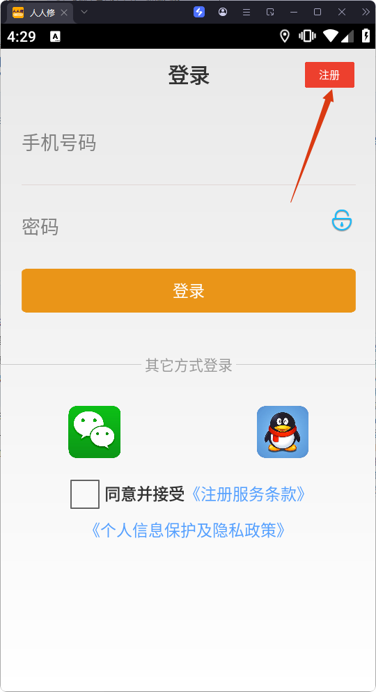 2、進入登錄頁面,點擊右上角【注冊】,進入注冊頁面。