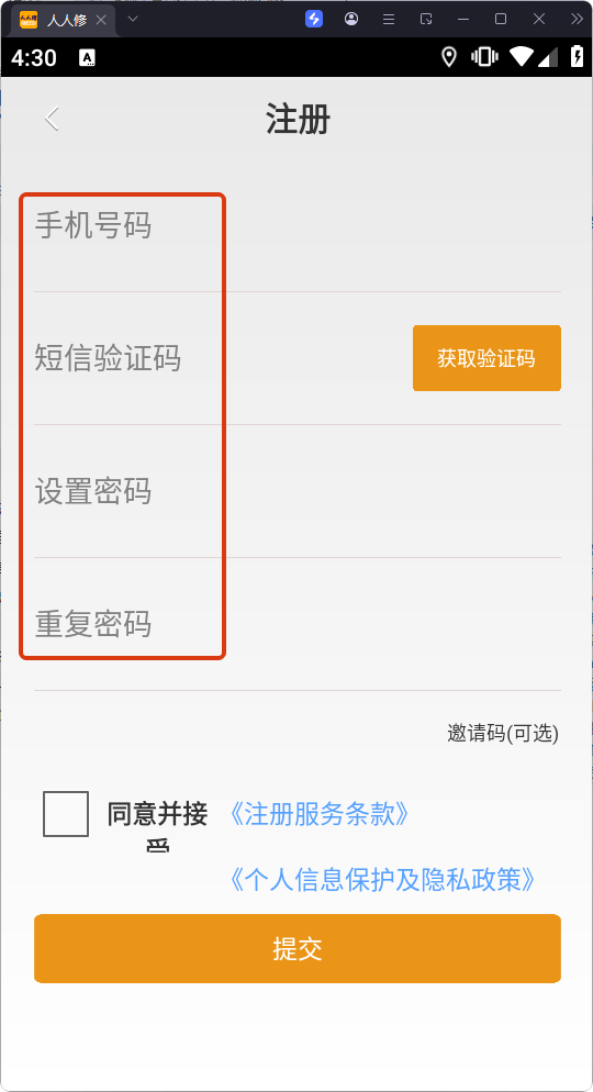 4、勾選同意《注冊服務(wù)條款》和《個人信息保護及隱私政策》后,點擊【提交】,完成賬號注冊操作。