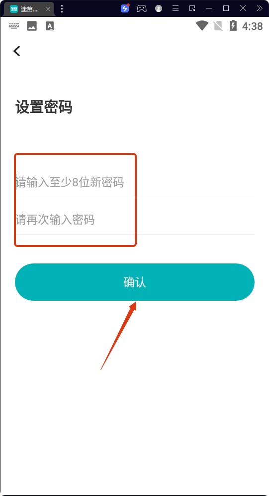 4、進入設(shè)置密碼頁面,輸入至少8位的新密碼并再次輸入確認,點擊【確認】,完成賬號注冊操作。