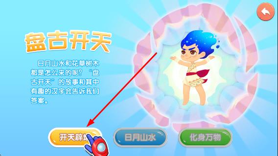 4、在故事動畫頁面觀看“盤古開天”的動畫內(nèi)容,學習相關漢字知識。