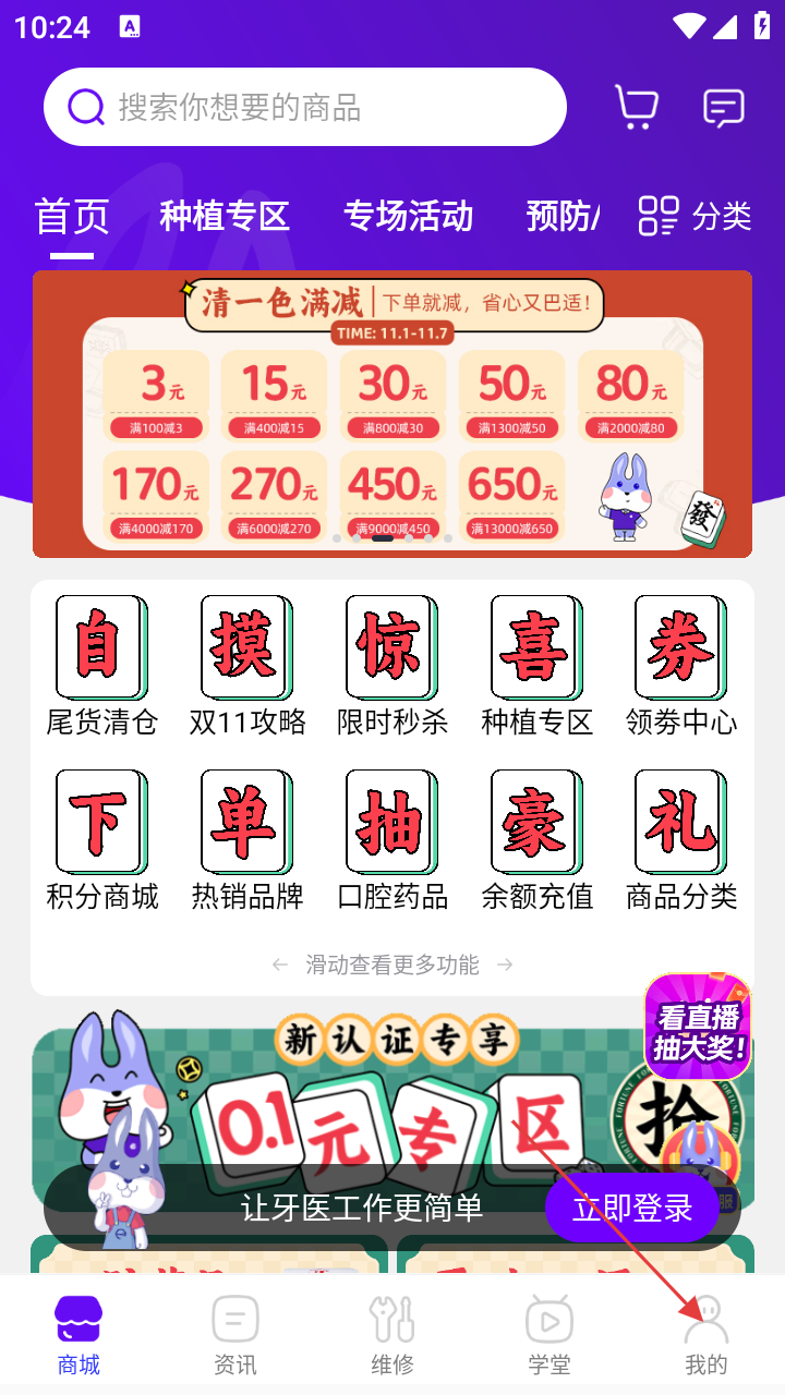 1、在商城首頁,點(diǎn)擊右下角【我的】,可進(jìn)入個(gè)人相關(guān)界面,首頁展示有商品分類、專場(chǎng)活動(dòng)等功能入口。