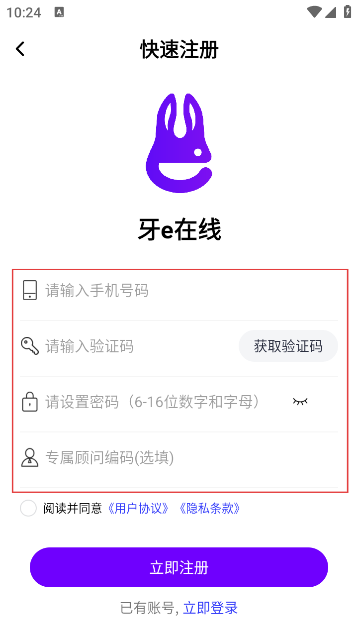 3、在快速注冊(cè)界面,需依次輸入手機(jī)號(hào)碼、驗(yàn)證碼,設(shè)置6-16位數(shù)字和字母組成的密碼,專屬顧問編碼選填,勾選同意協(xié)議后可進(jìn)行注冊(cè)。