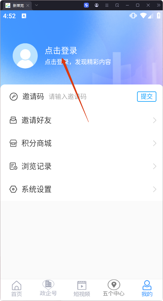 1、點擊底部【我的】,進入個人頁面,可查看登錄及邀請碼、積分商城等功能入口。