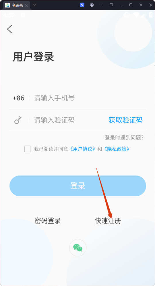 3、在用戶登錄頁面點擊【快速注冊】,進入用戶注冊頁面。