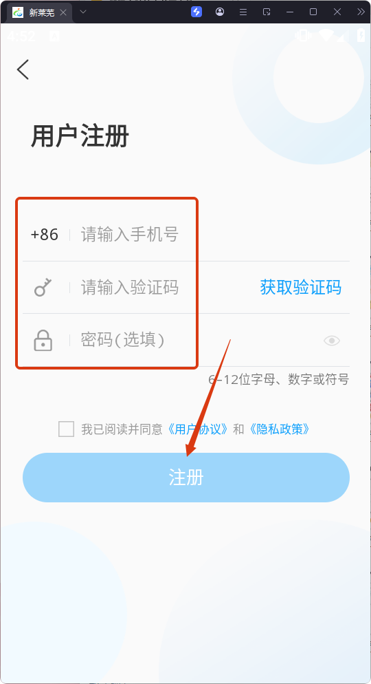 4、在用戶注冊頁面輸入【手機號】,點擊【獲取驗證碼】并輸入,密碼選填,勾選已閱讀并同意《用戶協(xié)議》和《隱私政策》后點擊【注冊】,完成賬號注冊操作。