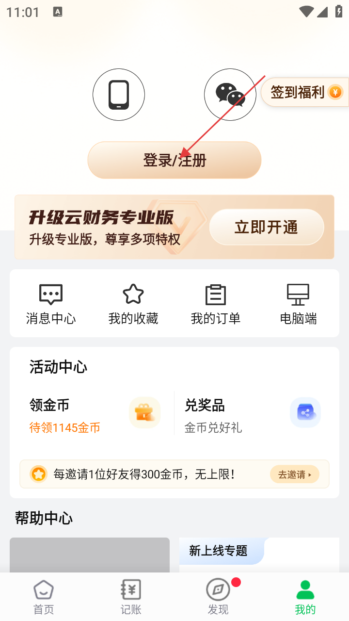 2、在【我的】界面,點(diǎn)擊【登錄/注冊】按鈕,可進(jìn)入登錄注冊界面,界面顯示消息中心、我的收藏等功能。