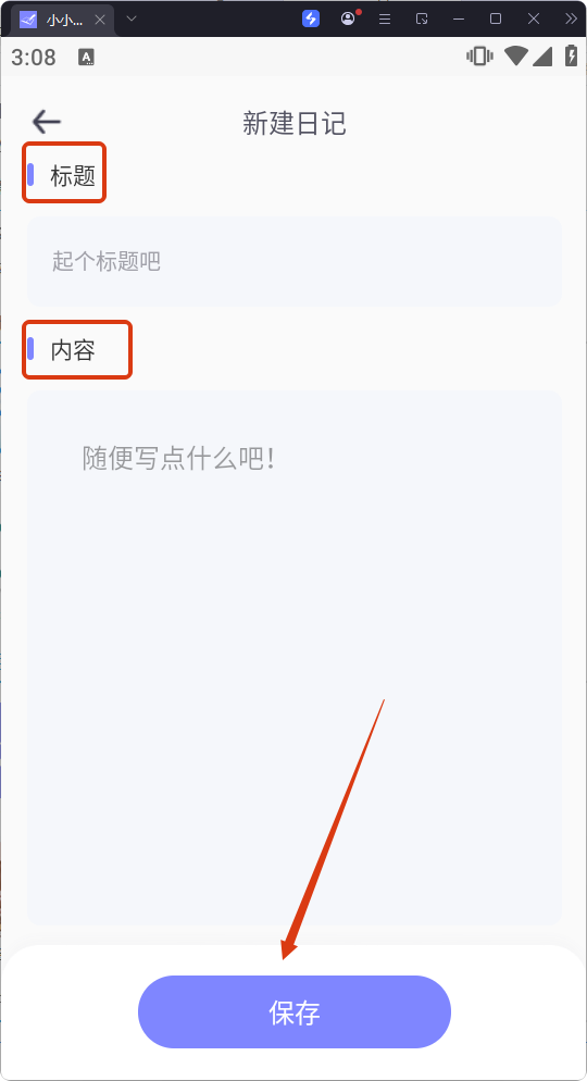 4、填寫日記【標(biāo)題】和【內(nèi)容】,點(diǎn)擊【保存】,完成日記創(chuàng)建操作。