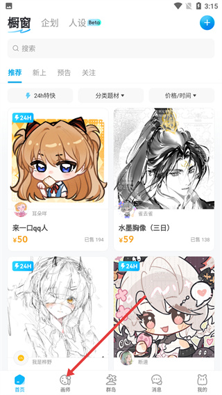 1、在APP首頁(yè),點(diǎn)擊【畫(huà)師】選項(xiàng)。