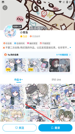 3、在畫(huà)師詳情頁(yè)面,點(diǎn)擊【邀請(qǐng)】按鈕,進(jìn)入邀請(qǐng)方式選擇頁(yè)面。