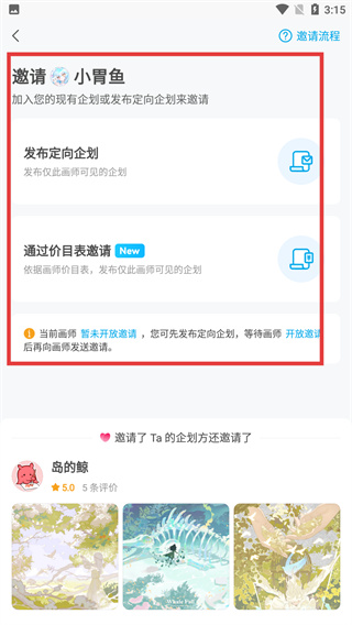 4、在邀請(qǐng)頁(yè)面,完成“發(fā)布定向企劃”或“通過(guò)價(jià)目表邀請(qǐng)”,按示完成畫(huà)師邀請(qǐng)操作。