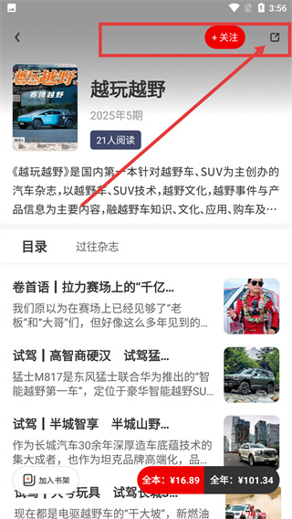 3、在雜志詳情頁面,點(diǎn)擊右上角分享圖標(biāo),調(diào)出分享渠道選擇彈窗。