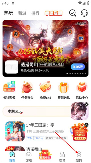 1、在游戲平臺(tái)首頁,點(diǎn)擊右下角【我的】,進(jìn)入個(gè)人界面。