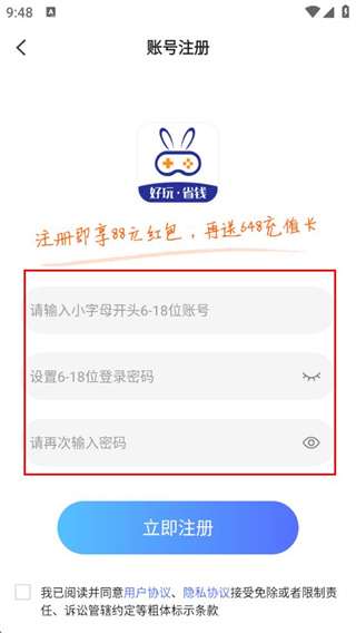 4、在賬號(hào)注冊界面,輸入賬號(hào)、設(shè)置登錄密碼并再次確認(rèn)密碼,勾選已閱讀并同意協(xié)議后,點(diǎn)擊【立即注冊】按鈕,即可完成賬號(hào)注冊。