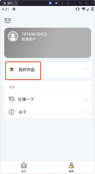 2、點(diǎn)擊底部【我的】,進(jìn)入個(gè)人頁(yè)面,可查看用戶賬號(hào)信息及我的作品等功能入口。