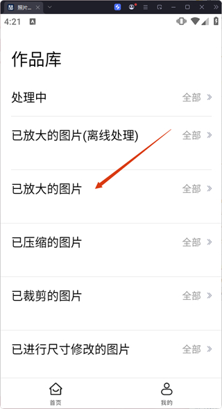 4、在作品庫(kù)中選擇【已放大的圖片】,即可查看所有已放大的圖片,便于管理和查看圖片處理成果。