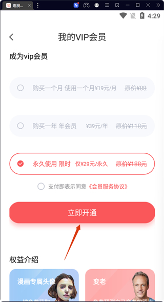 4、選擇VIP會員套餐,勾選同意《會員服務協(xié)議》后點擊【立即開通】,即可完成漫畫專屬頭像的制作。
