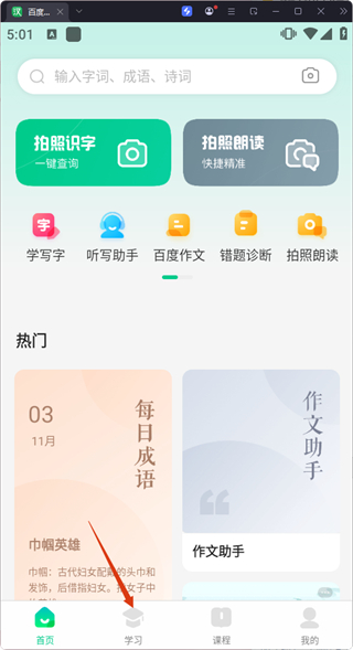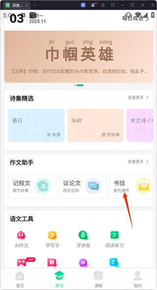 1、點擊底部【學習】,進入學習頁面,可查看【詩集精選】【作文助手】【語文工具】等板塊,開啟學習之旅。