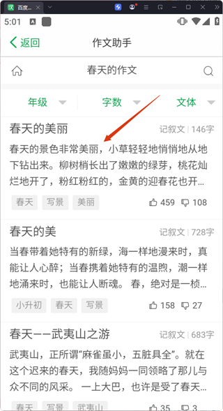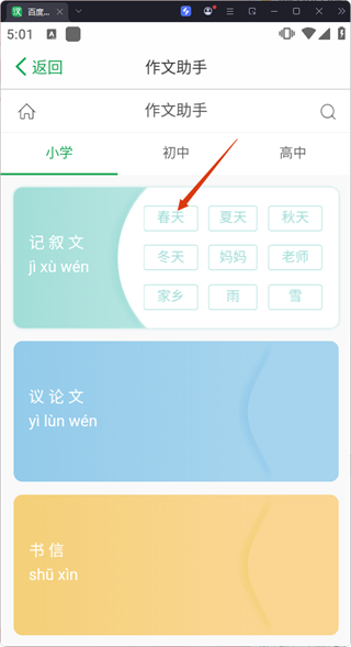 3、在作文助手小學板塊選擇【春天】主題,進入主題作文列表,可獲取寫作素材。