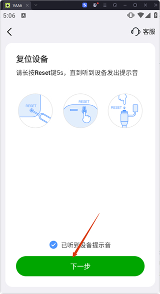 3、長按設(shè)備Reset鍵5秒,聽到提示音后勾選“已聽到設(shè)備提示音”,點擊【下一步】。