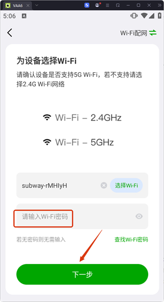 4、選擇WiFi網(wǎng)絡(luò)(注意設(shè)備是否支持5GWiFi),輸入WiFi密碼后點擊【下一步】,完成設(shè)備配網(wǎng)。