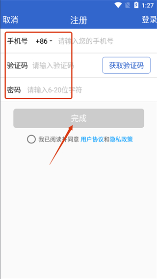 4、在注冊頁面輸入手機(jī)號、驗(yàn)證碼、密碼,勾選同意《用戶協(xié)議》和《隱私政策》后點(diǎn)擊【完成】,完成賬號注冊操作。