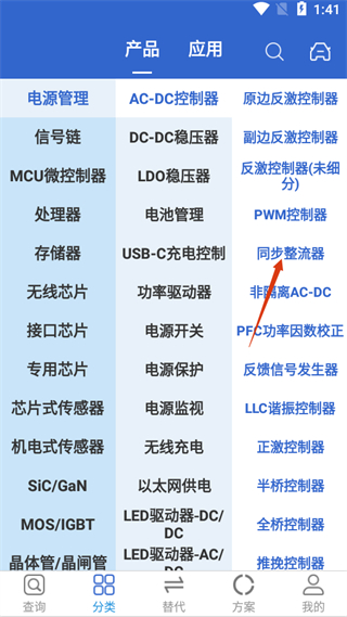 1、在分類頁(yè)面依次選擇【電源管理】-【AC-DC控制器】-【同步整流器】,進(jìn)入同步整流器列表頁(yè)面。