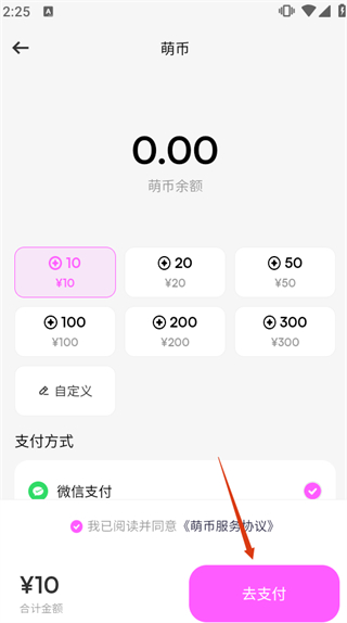 4、選擇萌幣金額和支付方式,勾選同意《萌幣服務(wù)協(xié)議》后點(diǎn)擊【去支付】,完成賬戶充值操作。