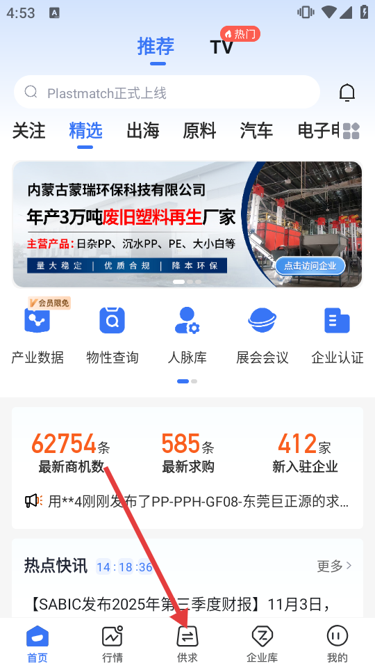 1、點擊底部【供求】,進入供求頁面,可見求購、供應等板塊及各類供求信息。