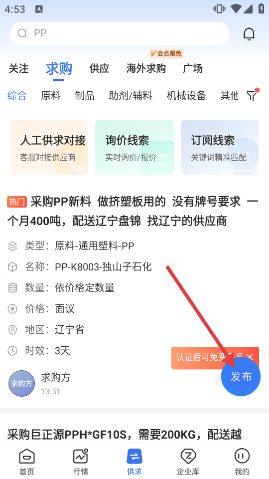 2、進入供求頁面,點擊頁面右側(cè)的【發(fā)布】,進入下一步。