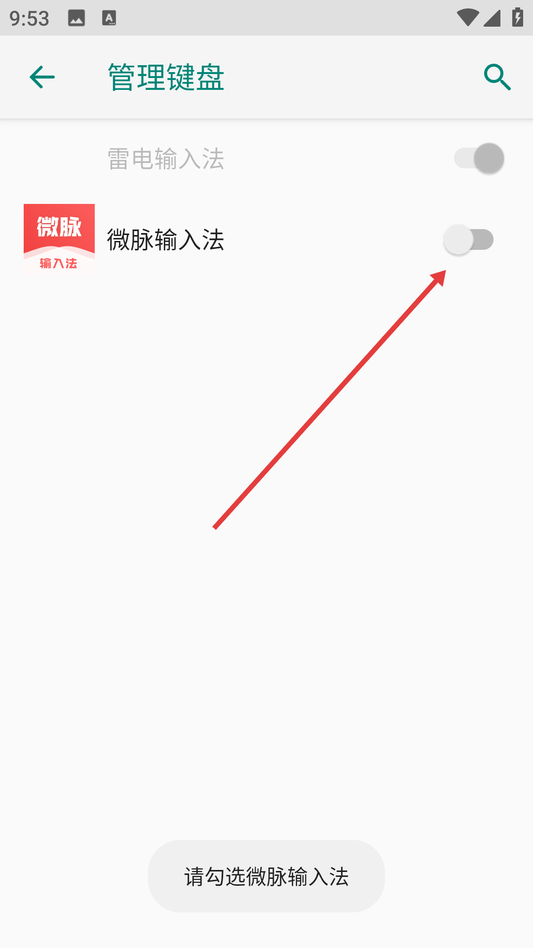 2、在管理鍵盤頁面點擊【微脈輸入法】的開關(guān)按鈕,勾選微脈輸入法。