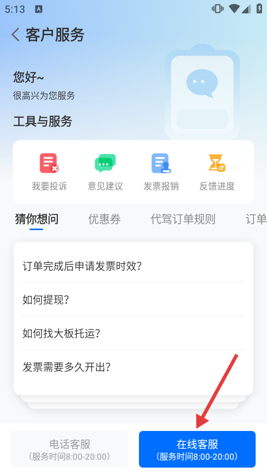 3、進入客戶服務(wù)頁面,選擇【在線客服】(服務(wù)時間8:00-20:00)。
