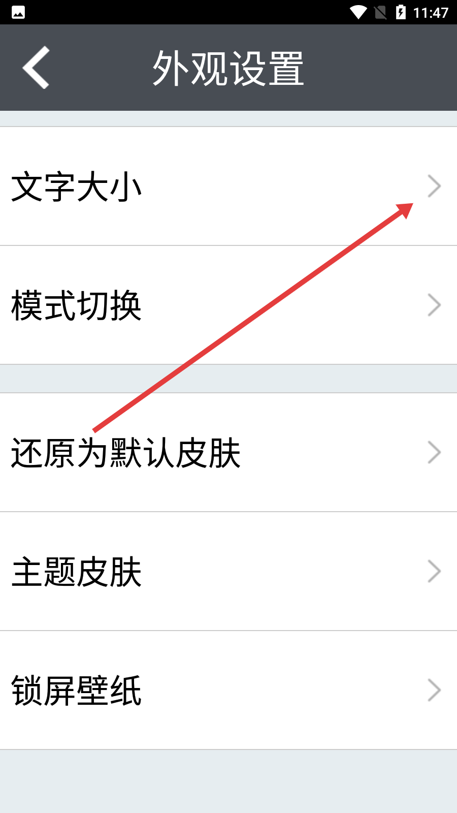 3、在【外觀設(shè)置】中,點(diǎn)擊【文字大小】,可選擇不同字號(hào)選項(xiàng)。