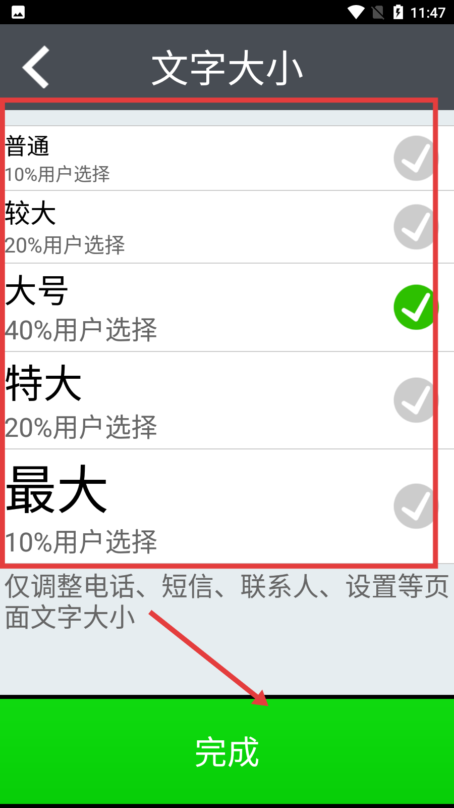 4、在【文字大小】頁(yè)面選好字號(hào)后,點(diǎn)擊【完成】,即可應(yīng)用文字大小設(shè)置。
