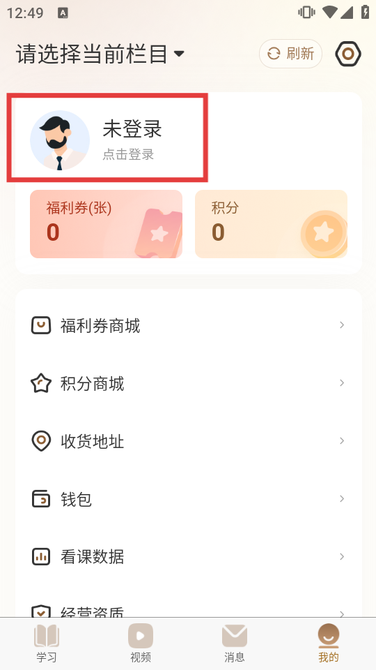 1、點擊底部【我的】,進(jìn)入個人頁面,可見未登錄狀態(tài)及福利券、積分等功能入口。
