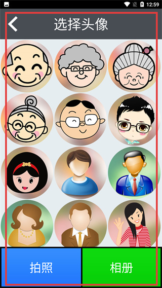 4、在【選擇頭像】界面,可從卡通頭像中選,也可點(diǎn)擊【拍照】或【相冊(cè)】自定義頭像,完成聯(lián)系人頭像設(shè)置。