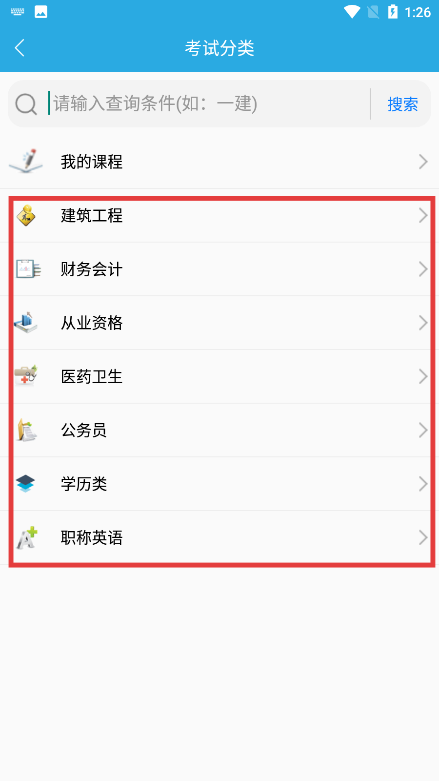 2、在【考試分類】頁面,可選擇【建筑工程】【財務(wù)會計】等大類,定位目標(biāo)考試類別。