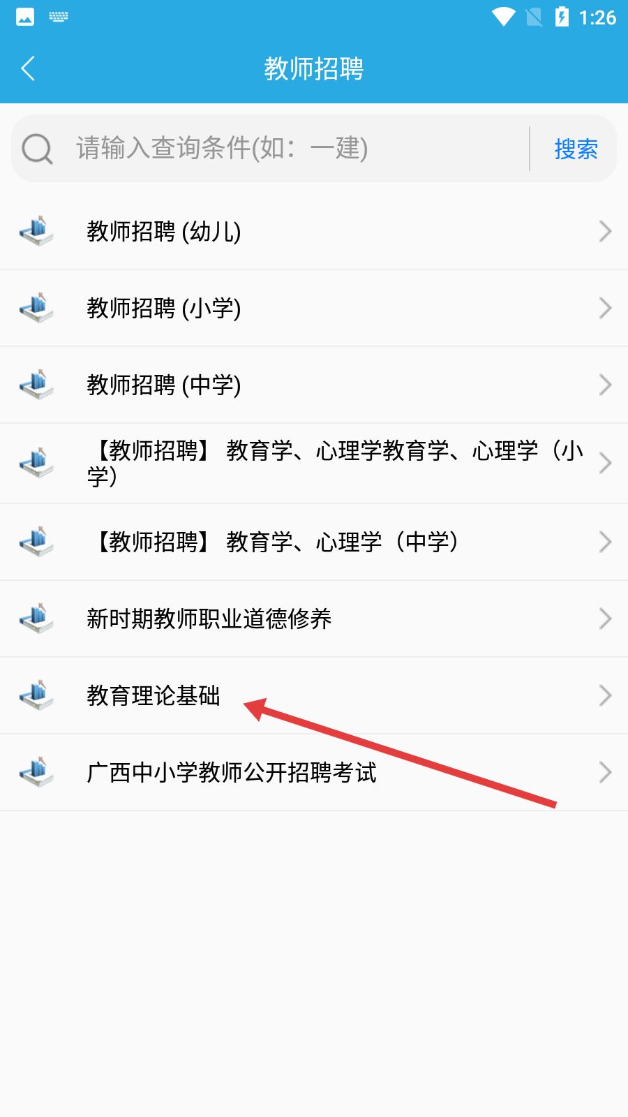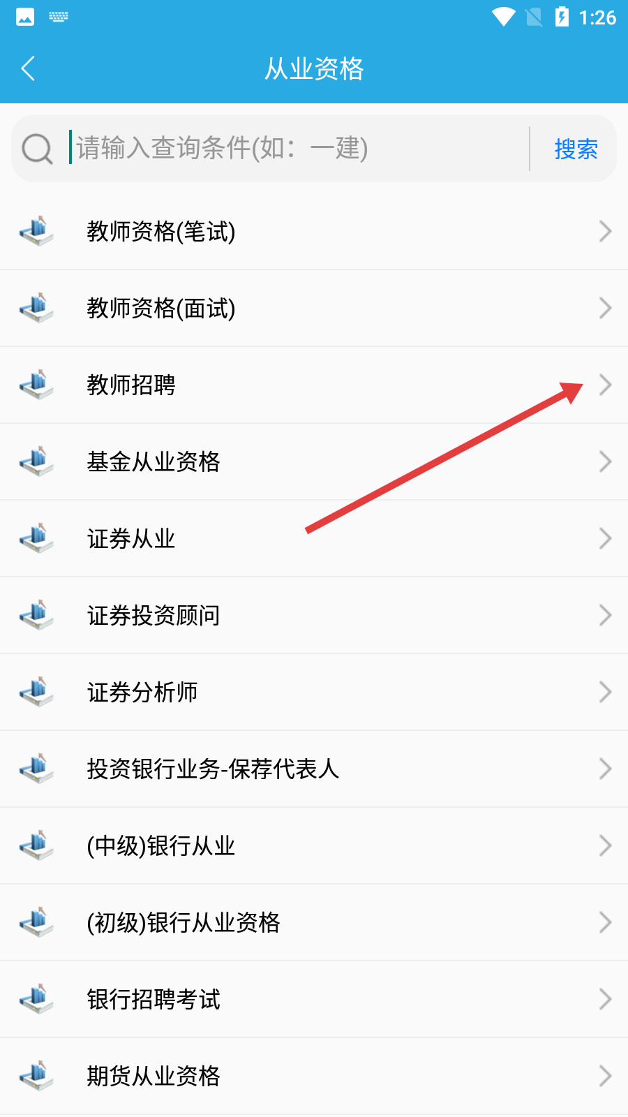 3、進入【從業(yè)資格】后,點擊【教師招聘】,進入教師招聘考試科目列表。