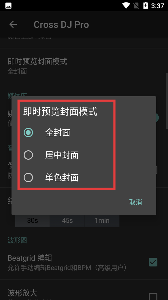 4、在彈窗中選擇所需模式(如全封面),完成即時預(yù)覽封面模式設(shè)置操作。