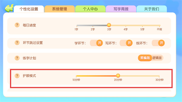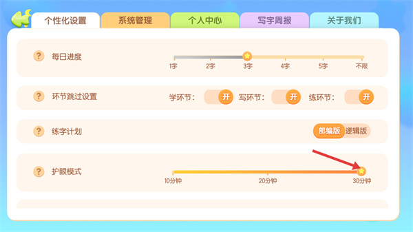 4、將護(hù)眼模式的時(shí)間滑塊拖動到對應(yīng)的時(shí)間,完成休息時(shí)間設(shè)置。