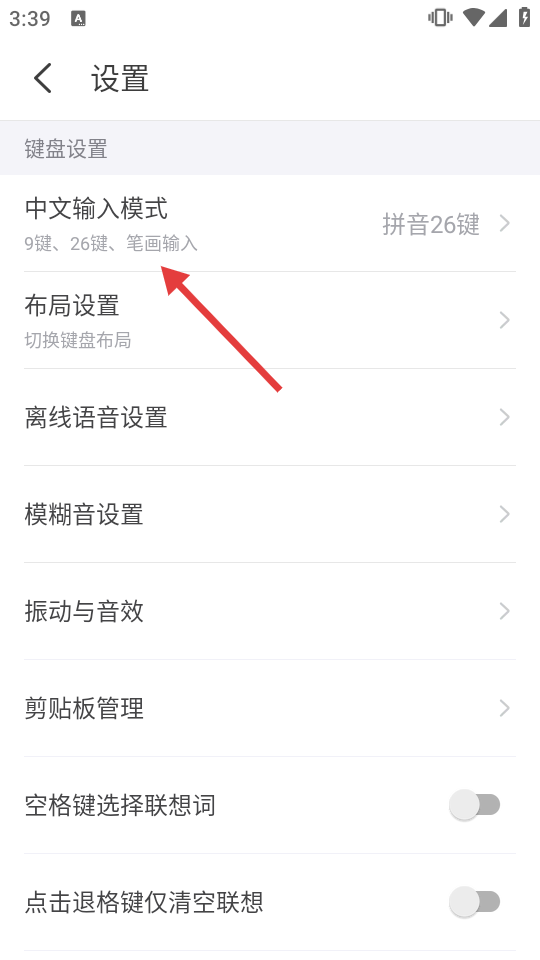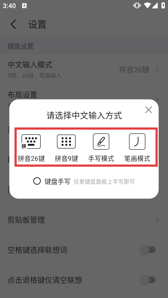 3、在設置頁面點擊【中文輸入模式】,彈出“請選擇中文輸入方式”選擇框。